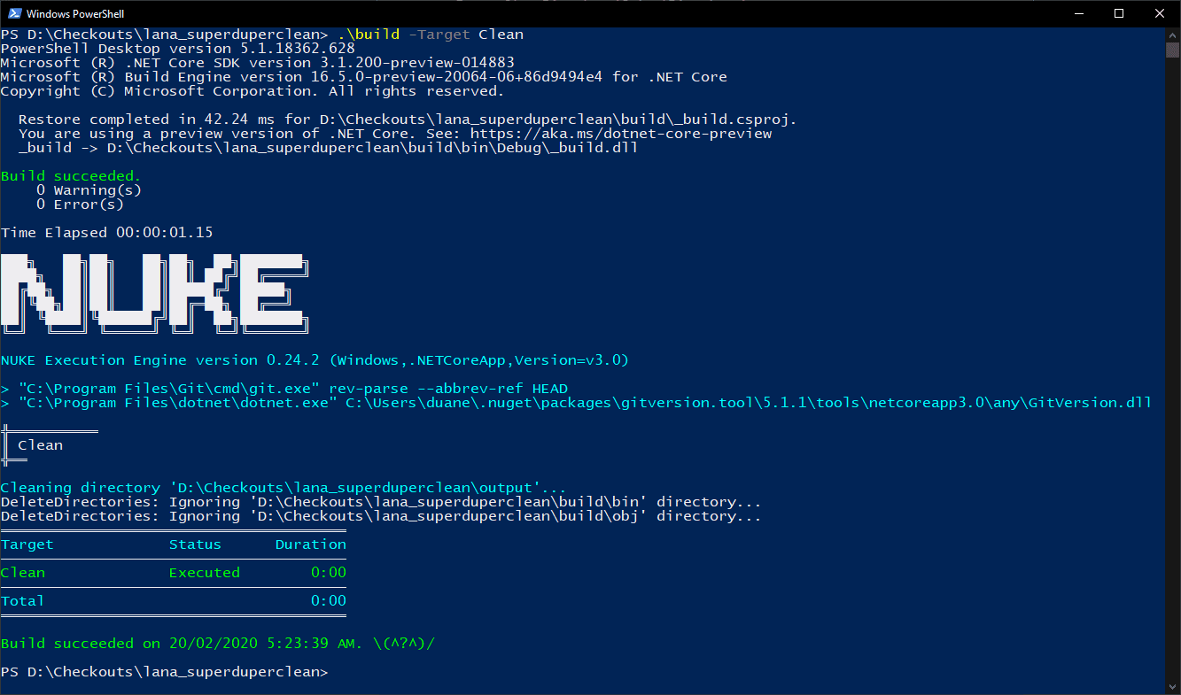 To run the Clean target from a PowerShell terminal, simply navigate to the Solution folder, where the build.nuke file exists and run the command: